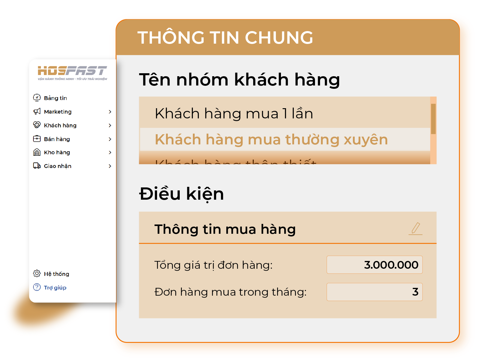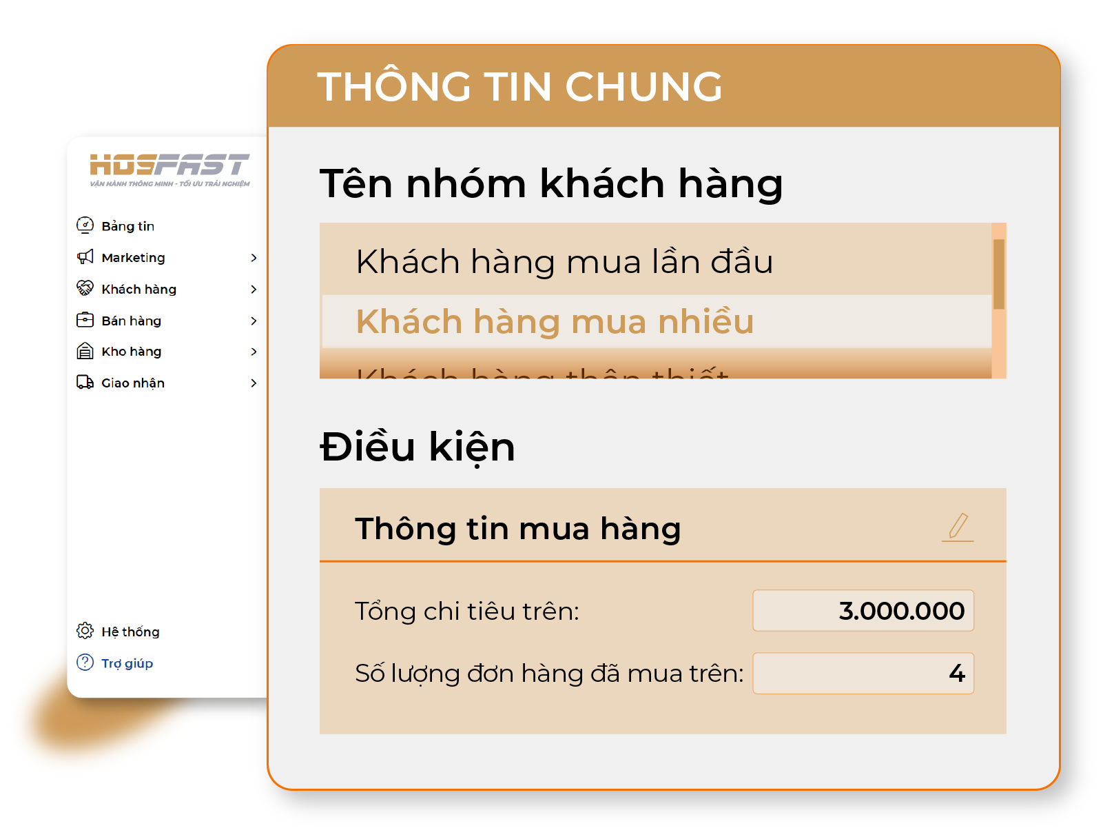 Phần mềm Marketing Hosfast giúp chủ kinh doanh gửi chiến dịch Marketing tới từng nhóm khách hàng phù hợp theo từng chiến dịch tự động để push sale, chăm sóc khách hàng, hoặc có thể theo từng điều kiện cụ thể như số lượng đơn hàng, hạng thẻ của khách hàng hay các điều kiện về thông tin nhân khẩu học.